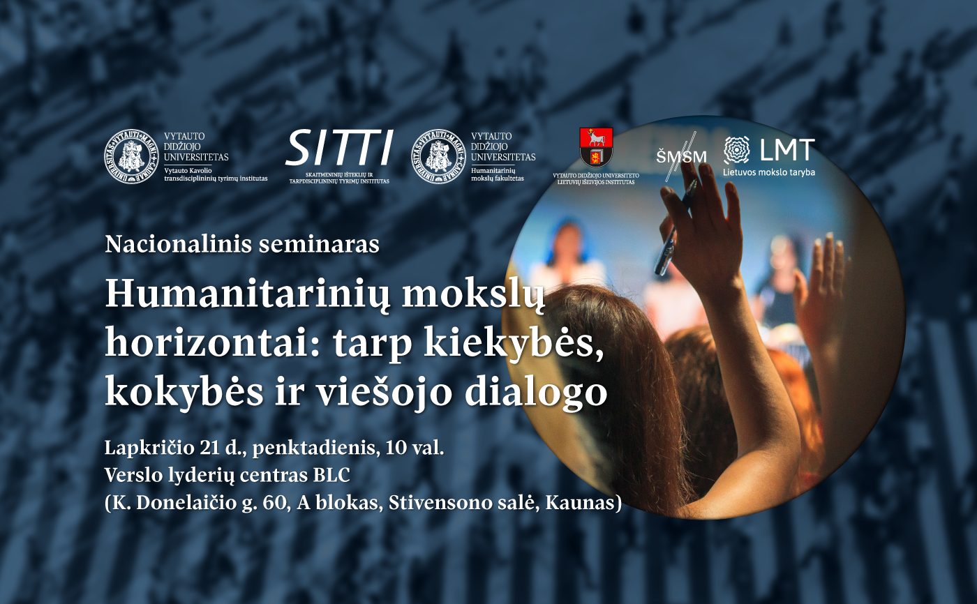 Vytauto Didžiojo universiteto V. Kavolio transdisciplininių tyrimų institutas kviečia dalyvauti nacionaliniame seminare, skirtame aptarti humanitarinių mokslų reikšmę šiuolaikinėje akademinėje ir viešojoje erdvėje. Diskusijos ašyje – trys raktiniai žodžiai: svarba, poveikis ir tarpdiscipliniškumas. Renginio metu bus keliami klausimai, kaip humanitariniai mokslai derina kiekybinius rodiklius ir kokybinius vertinimus, kaip vertinamas jų poveikis visuomenei bei kaip įgyvendinamas tarpdiscipliniškumas.