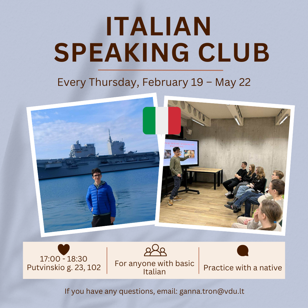 Rudens ir pavasario semestrų metu Vytauto Didžiojo universitete studijuoja nemažai italų studentų pagal „Erasmus“ mainų programą. Jie noriai dalijasi savo kalba, kultūra ir patirtimis su VDU bendruomene, todėl pokalbių klubas tapo puikia erdve neformaliam bendravimui ir kalbos praktikai.