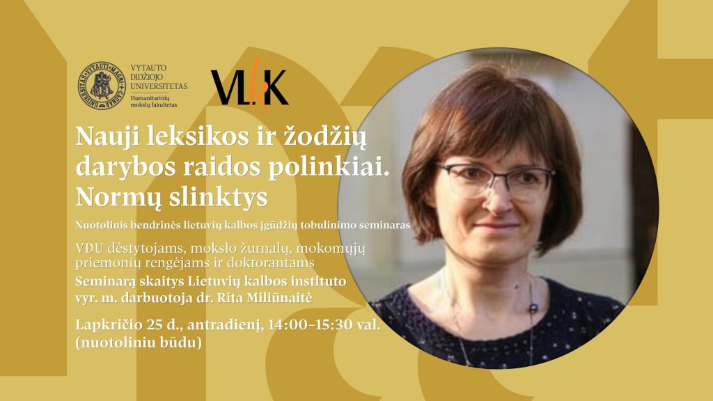 Visus VDU dėstytojus, mokslo žurnalų, mokomųjų priemonių rengėjus, doktorantus kviečiame dalyvauti VLKK organizuojamame nuotoliniame bendrinės lietuvių klabos įgūdžių tobulino seminare „Nauji leksikos ir žodžių darybos raidos polinkiai. Normų slinktys.“