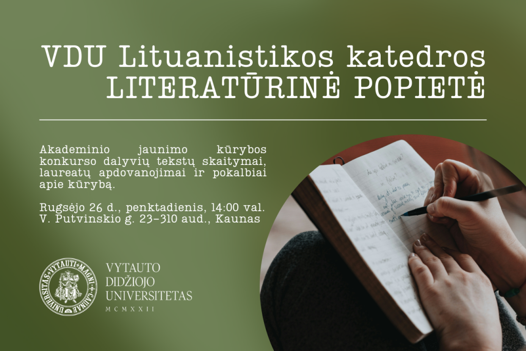 Pavasarį surengto Akademinio jaunimo kūrybos konkurso dalyvius ir visą Lituanistikos katedros bendruomenę kviečiame į rugsėjo 26 d., 14 val. vyksiančią Literatūrinę popietę. Jos metu paskelbsime ir apdovanosime konkurso laureatus, klausysimės jų sukurtų poezijos ir prozos kūrinių, o konkurso komisija pasidalins savo mintimis ir patarimais, kurie padės tobulinti rašymo įgūdžius.