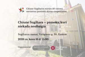 Kovo 16 d. 15:00 val. Sugiharos namuose Kaune vyks simpoziumas, skirtas Chiune Sugiharos mirties 40-osioms metinėms paminėti – „Chiune Sugihara – pamoka, kuri niekada nesibaigia“. Tai Japonijos ambasados Lietuvoje ir Sugiharos namų organizuojamo renginių ciklo, skirto minėtosioms mirties meti...