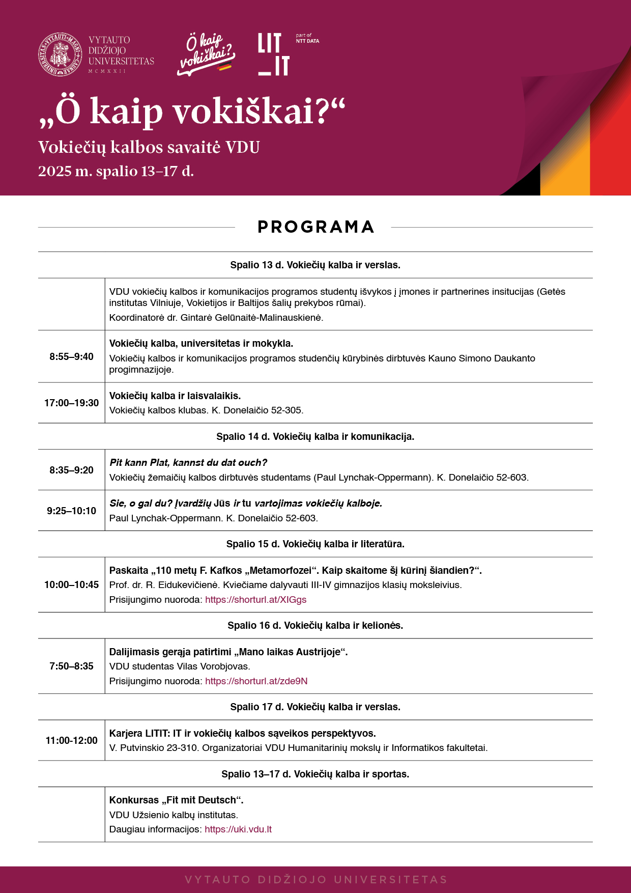„Šiandien, kai Lietuvoje vokiečių kalbą galime išgirsti vis dažniau ir plačiau, į VDU renginius norime pakviesti įvairaus amžiaus ir įvairių profesijų vokiečių kalbos mylėtojus. Vokiečių kalba Lietuvoje tampa vis aktualesnė – Vokietija išlieka viena svarbiausių mūsų šalies ekonominių partnerių, be to, sparčiai plečiasi bendradarbiavimas saugumo srityje. Daugiakalbystė šiandien reiškia atvirumą, lankstumą ir gebėjimą kurti tiltus tarp žmonių, o savo kalbinių kompetencijų rinkinį papildžius vokiečių kalba galima ženkliai praplėsti karjeros galimybes ir praturtinti patirtis,“ – teigia vokiečių kalbos dėstytoja, studijų programos „Vokiečių kalba ir komunikacija“ vadovė dr. Gintarė Gelūnaitė-Malinauskienė.